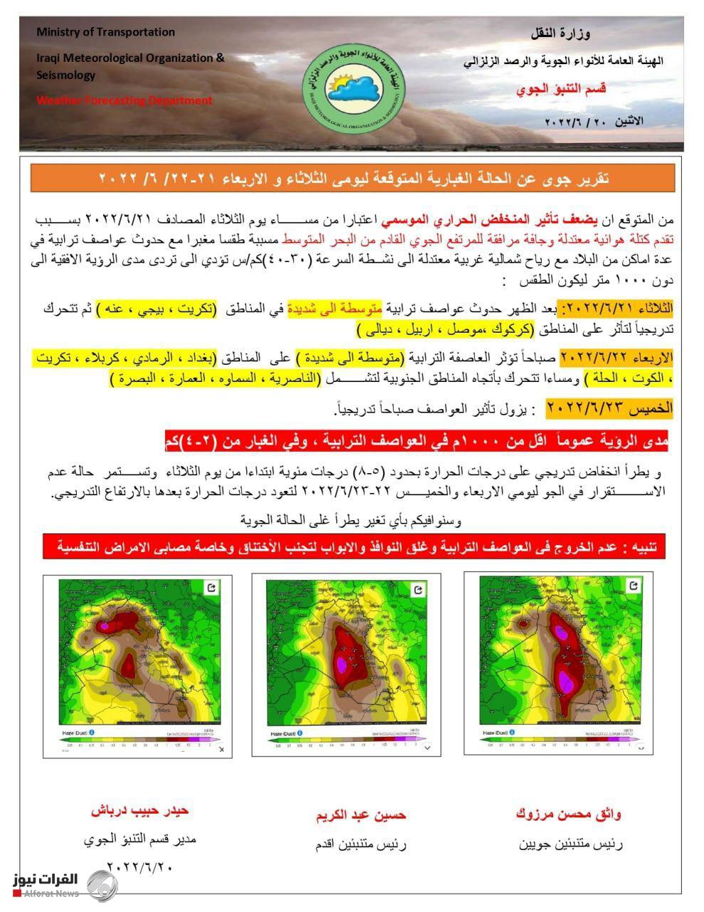 وأشارت في تقريرها الى انعدام الرؤية لأقل من 1000 متر مع انخفاض الحرارة من 5-8 درجات مئوية.