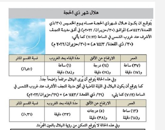 يتوقع ان يكون هلال شهر ذي الحجة مساء يوم الخمس (30/ ذي القعدة 1443هـ) الموافق (30/ حزيران 2022) في أفق مدينة النجف الأشرف عند غروب الشمس في الساعة (07:03) كما يأتي: