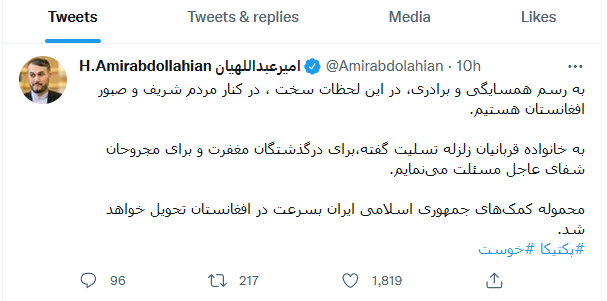 وفي تغريدة له على تويتر إثر الزلزال الذي ضرب أمس الاربعاء ولايتي خوست وبكتيكا بأفغانستان وخلف اضرارا وخسائر كبيرة بالارواح، كتب حسين امير عبداللهيان: التزاما بواجب الجوار والأخوة، نقف في هذه اللحظات العصيبة الى جانب الشعب الافغاني الشريف والصبور.