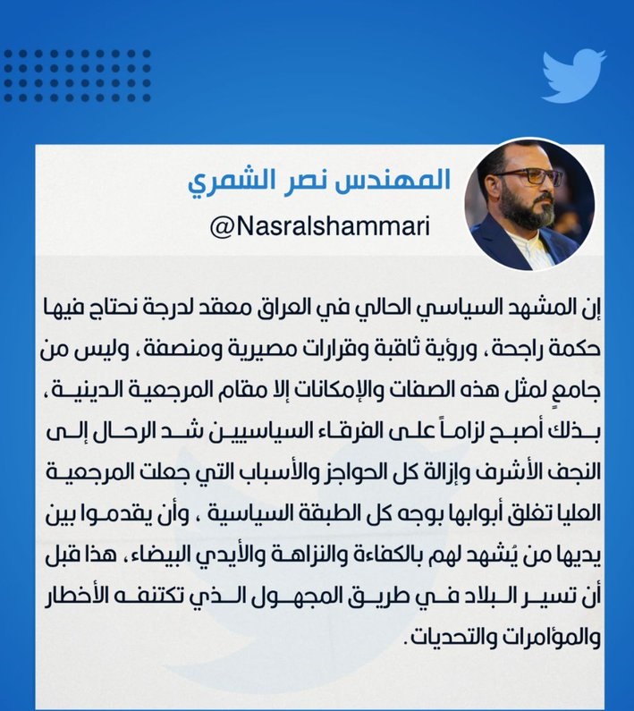 وأفاد المكتب الاعلامي لحركة النجباء في الجمهورية الاسلامية الإيرانية، أن المتحدث الرسمي باسم الحركة أشار في تغريدة له الى الوضع السياسي الراهن في العراق، معلنا أن "المشهد السياسي الحالي في العراق معقد لدرجة نحتاج فيه الى حكمة راجحة ورؤية ثاقبة وقرارات مصيرية ومنصفة وليس جامع لمثل هذه الصفات والامكانات إلا مقام المرجعية الدينية".