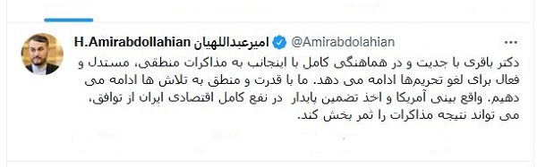 يذکر أن وزير الخارجية" حسين أمير عبداللهيان" کتب في تغريدة على تويتر أمس الجمعة: إن علي باقري كني سيواصل بجدية وبالتنسيق الكامل معي المفاوضات المنطقية والمعقولة والنشطة الرامیة لإلغاء الحظر عن الجمهوریة الإسلامية الإيرانية.