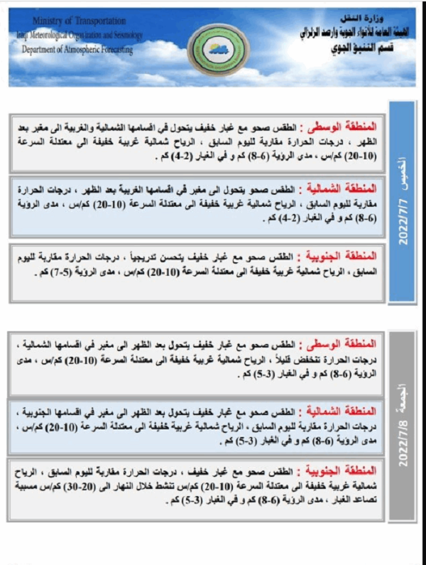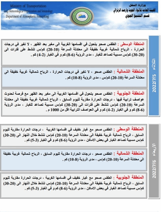 وأدناه جداول توضح حالة الطقس بالتفصيل للأيام الأربعة المقبلة:
