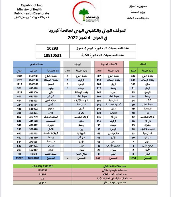 وبحسب الموقف الوبائي ان :"المؤسسات الصحية سجلت اليوم 3491 اصابة جديدة بكورونا و1354 حالة شفاء و4 وفيات خلال الـ24 ساعة الماضية، فيما بلغ عدد الذين تلقوا اللقاح اليوم 13762 شخصاً".