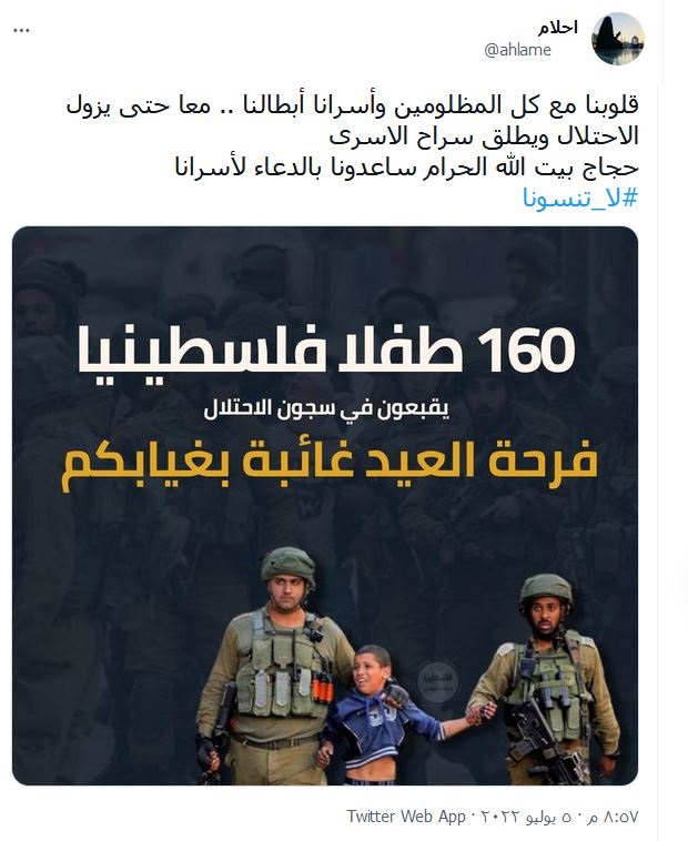 "احلام" علقت قائلة: قلوبنا مع كل المظلومين وأسرانا أبطالنا .. معا حتى يزول الاحتلال ويطلق سراح الاسرى حجاج بيت الله الحرام ساعدونا بالدعاء لأسرانا #لا_تنسونا