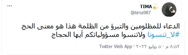 "TIma" قالت: الدعاء للمظلومين والتبرؤ من الظلمة هذا هو معنى الحج #لا_تنسونا ولاتنسوا مسؤولياتكم أيها الحجاج