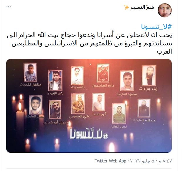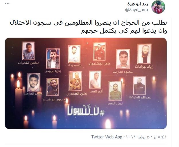 "زيد ابو عرة" غرد قائلا: نطلب من الحجاج ان ينصروا المظلومين في سجون الاحتلال وان يدعوا لهم كي يكتمل حجهم.