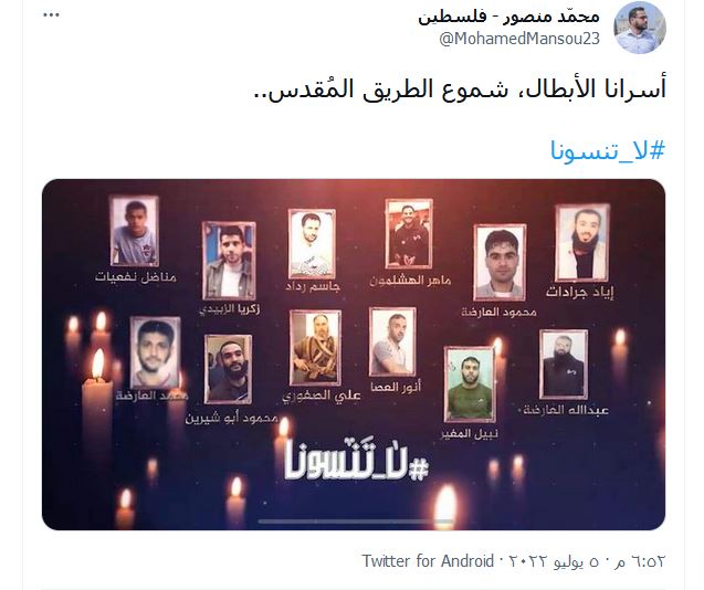 عن اخوانكم الأسرى داخل السجون: محمود عارضة، محمد عارضة، نبيل المغير، زكريا الزبيدي، مناضل نفعيات، علي الصفوري، ماهر الهشلمون، أنور العصا، عبد الله عارضة، جاسر رداد، إياد جرادات، محمود أبو شيرين)