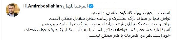 وكتب أمير عبداللهيان في تغريدة على تويتر : أجريت مباحثات هاتفية مع منسق السياسة الخارجية والأمنية بالاتحاد الأوروبي "جوزيف بوريل" الليلة ( مساء أمس الثلاثاء)، مؤكدا أن التوصل إلى اتفاق ممكن فقط على أساس الفهم المشترك واحترام المصالح المتبادلة.
