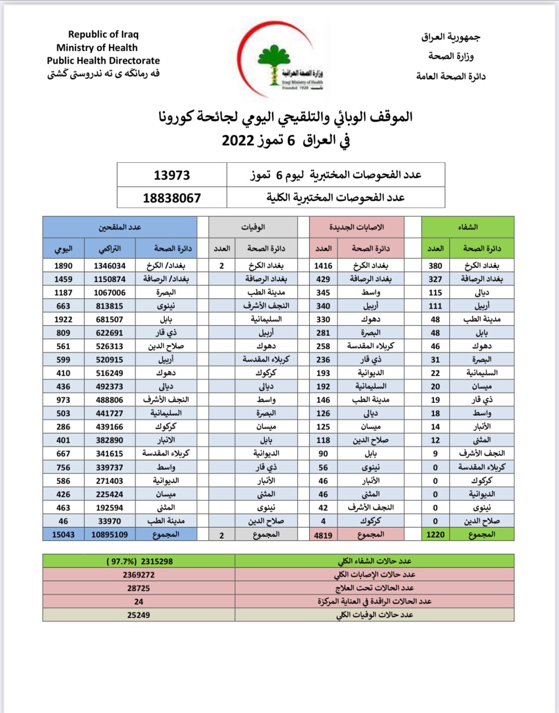 وأشارت إلى تلقي 15043 للقاح الجائحة خلال الساعات الـ24 الماضية.