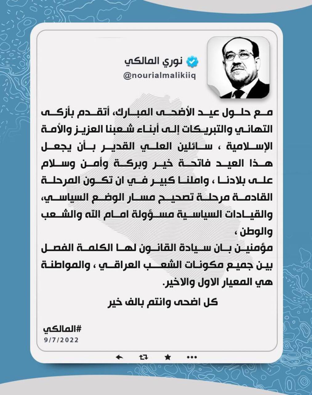 العراق-الكوثر: هنأ رئيس ائتلاف دولة القانون في العراق نوري المالكي أبناء الشعب العراقي بحلول عيد الأضحى المبارك، معربا عن أمله بأن تكون المرحلة القادمة مرحلة تصحيح مسار الوضع السياسي.