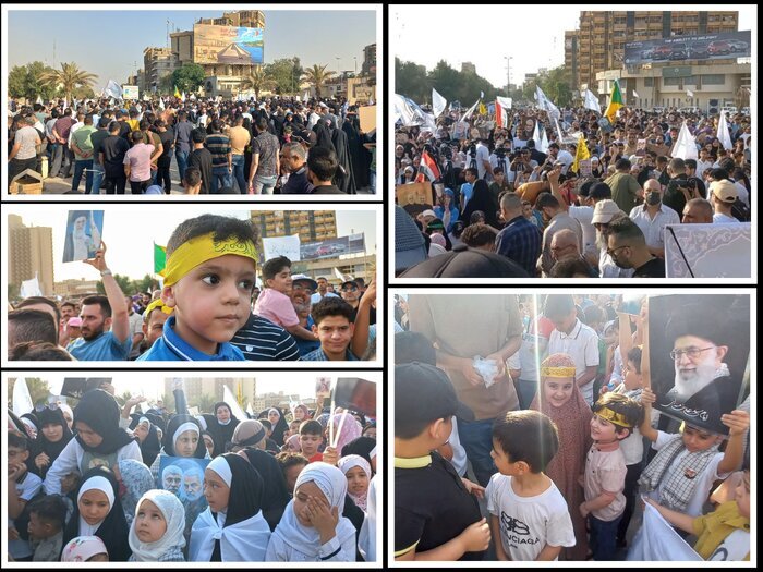 وغنى الأطفال العراقيون هذا النشيد بنسخته العربية بلهجة عراقية جميلة. وهتف المشاركون شعار"إيران والعراق.. لأيمكن الفراق" ورفعوا صور الشهيدين قاسم سليماني وأبو مهدي المهندس ولافتات تؤكد وحدة شعبي البلدين العظيمين.