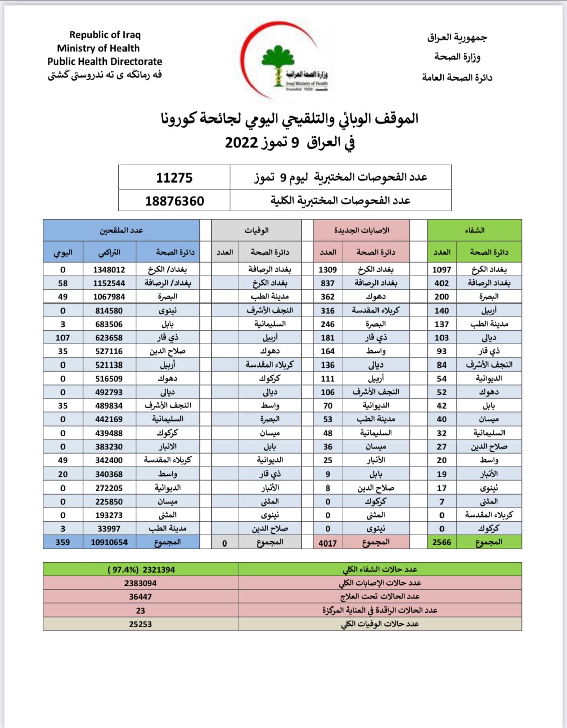 وقالت الوزارة في بيان إنها سجلت 4017 حالة إصابة جديدة، مقابل تماثل 2566 حالة للشفاء، دون تسجيل وفيات. وأشارت إلى تلقي 359 شخصاً للقاح الجائحة خلال الساعات الـ24 الماضية.