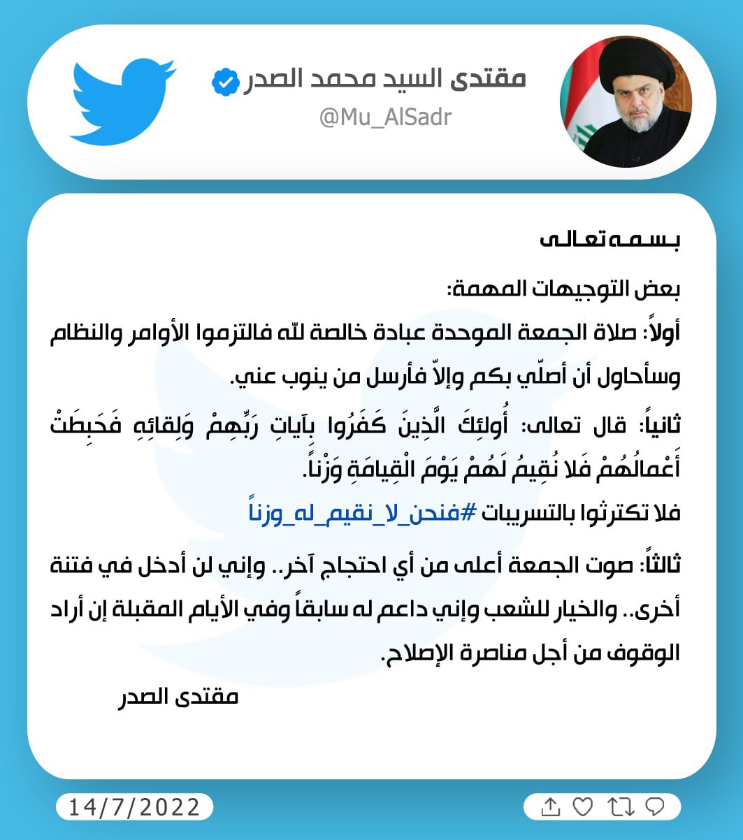 وذكر الصدر في تغريدة له على تويتر، "صلاة الجمعة الموحدة عبادة خالصة لله فالتزموا الأوامر والنظام، وسأحاول أن أصلي بكم وإلا فأرسل مَن ينوب عني".
