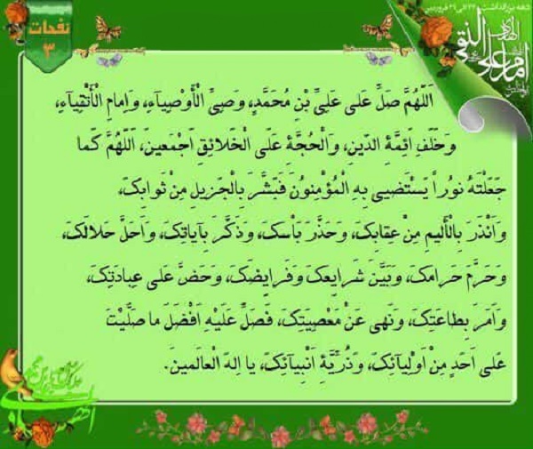 اَللّـهُمَّ صَلِّ عَلى عَلِيِّ بْنِ مُحَمَّد، وَصِىِّ الاَوْصِياءِ وَإمامِ الاَتْقِياءِ، وَخَلَفِ اَئِمَّةِ الدّينِ وَالْحُجَّةِ عَلَى الْخَلائِقِ اَجْمَعينَ، اَللّـهُمَّ كَما جَعَلْتَهُ نُوراً يَسْتَضيءُ بِهِ الْمُؤْمِنُونَ، فَبَشَّرَ بِالْجَزيلِ مِنْ ثَوابِكَ وَاَنْذَرَ بِالاَليمِ مِنْ عِقابِكَ، وَحَذَّرَ بَأسَكَ وَذَكَّرَ بِاياتِكَ وَاَحَلَّ حَلالَكَ وَحَرَّمَ حَرامَكَ، وَبَيَّنَ شَرايِعَكَ وَفَرايِضَكَ، وَحَضَّ عَلى عِبادَتِكَ وَاَمَرَ بِطاعَتِكَ وَنَهى عَنْ مَعْصِيَتِكَ، فَصَلِّ عَلَيْهِ اَفْضَلَ ما صَلَّيْتَ عَلى اَحَد مِنْ اَوْلِيائِكَ وَذُرِّيَّةِ اَنْبِيائِكَ، يا اِلـهَ الْعالَمينَ.
