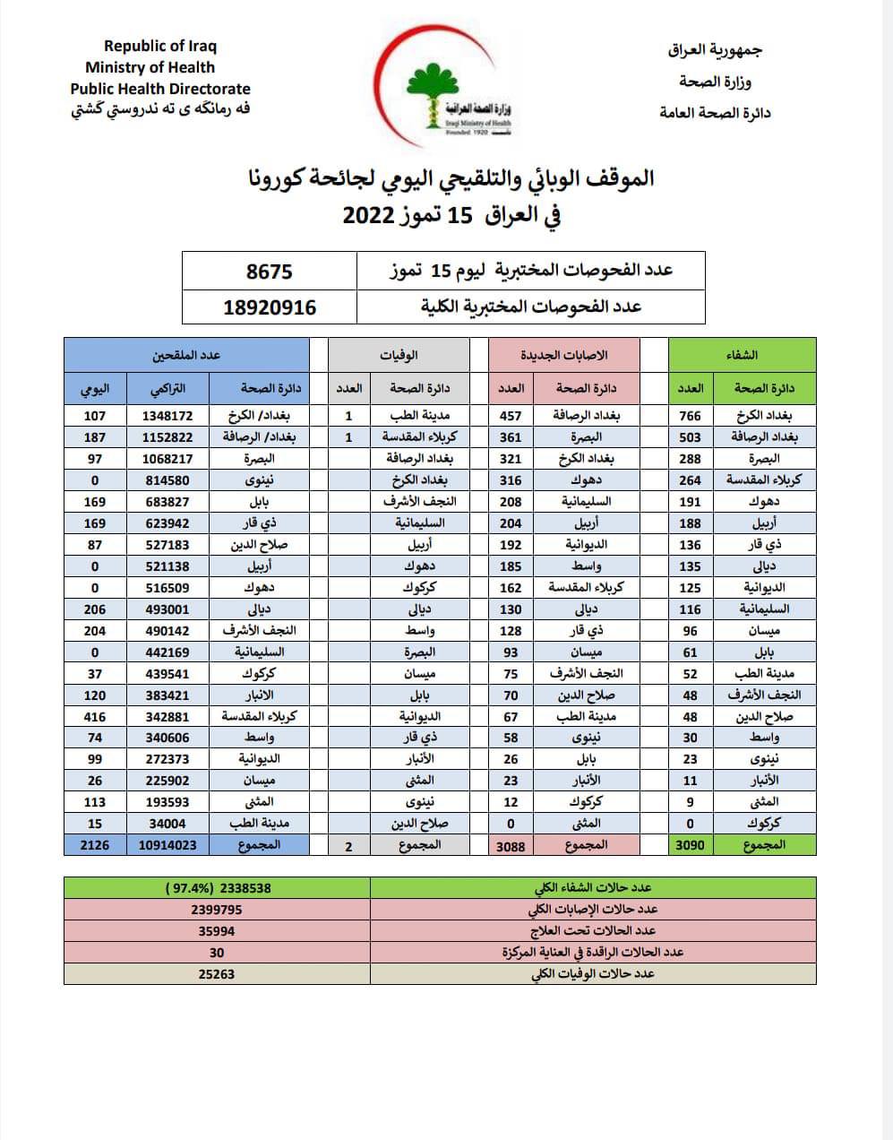 وقالت الوزارة في بيان إنها سجلت 3088 حالة إصابة جديدة، مقابل تماثل 3090 حالة للشفاء، وحالتي وفاة بالفيروس. وأشارت إلى تلقي 2126 شخصاً للقاح الجائحة خلال الساعات الـ 24 الماضية في عموم العراق.