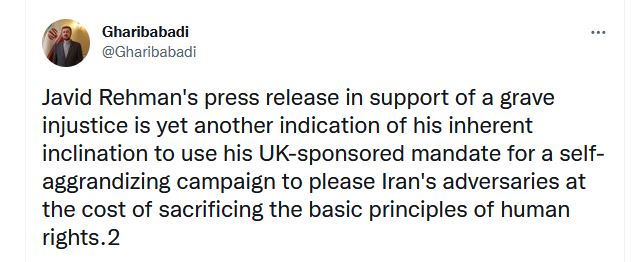 واضاف غريب آبادي: البيان الصحفي الصادر عن جاويد رحمن دعما لظلم فادح مؤشر آخر على رغبته الذاتية في إساءة استخدام مهمته ، التي تم إنشاؤها بدعم بريطاني ، لحملة تضخيم لإرضاء المناهضين لإيران على حساب التضحية بالمبادئ الأساسية لحقوق الإنسان.