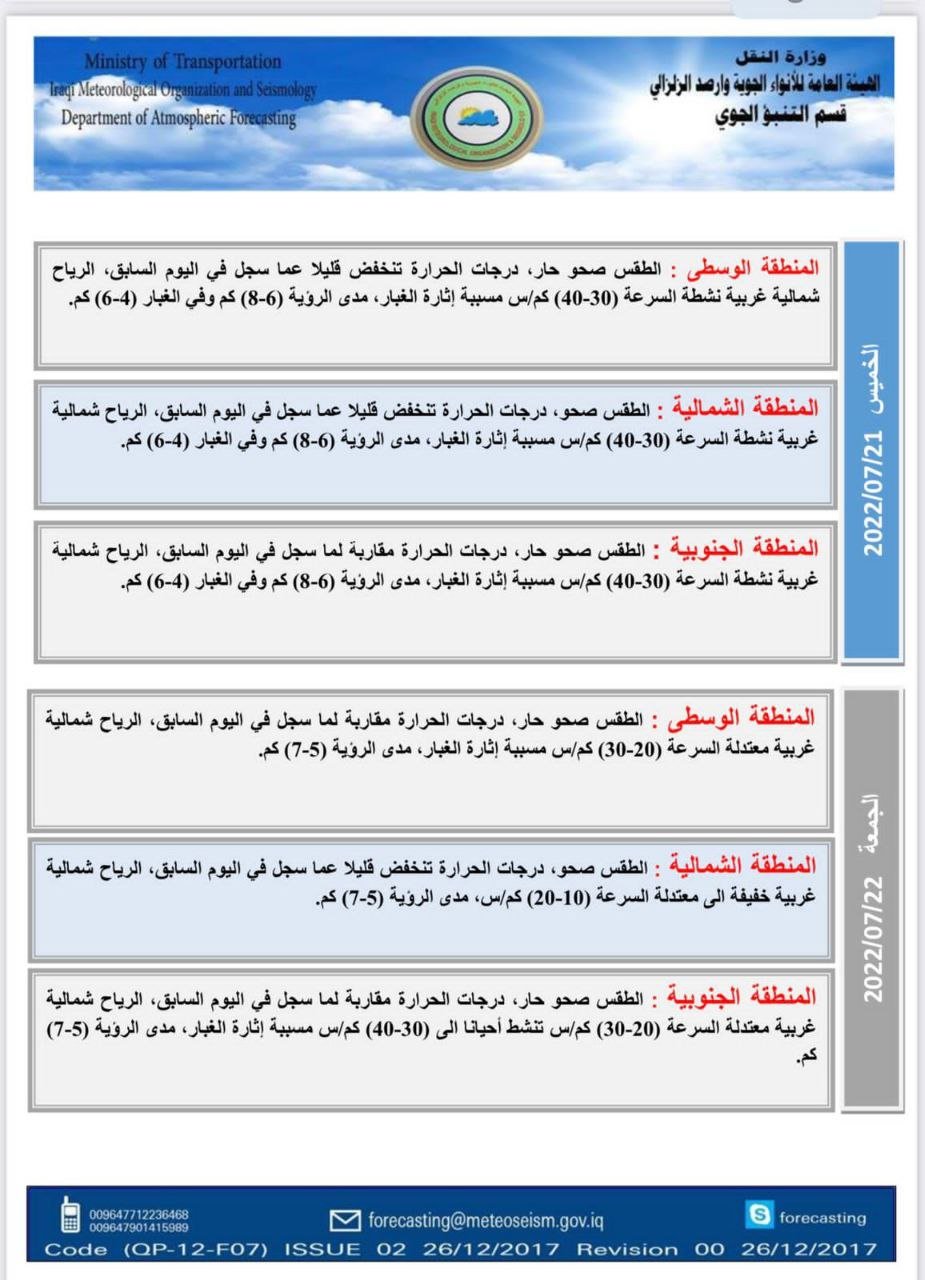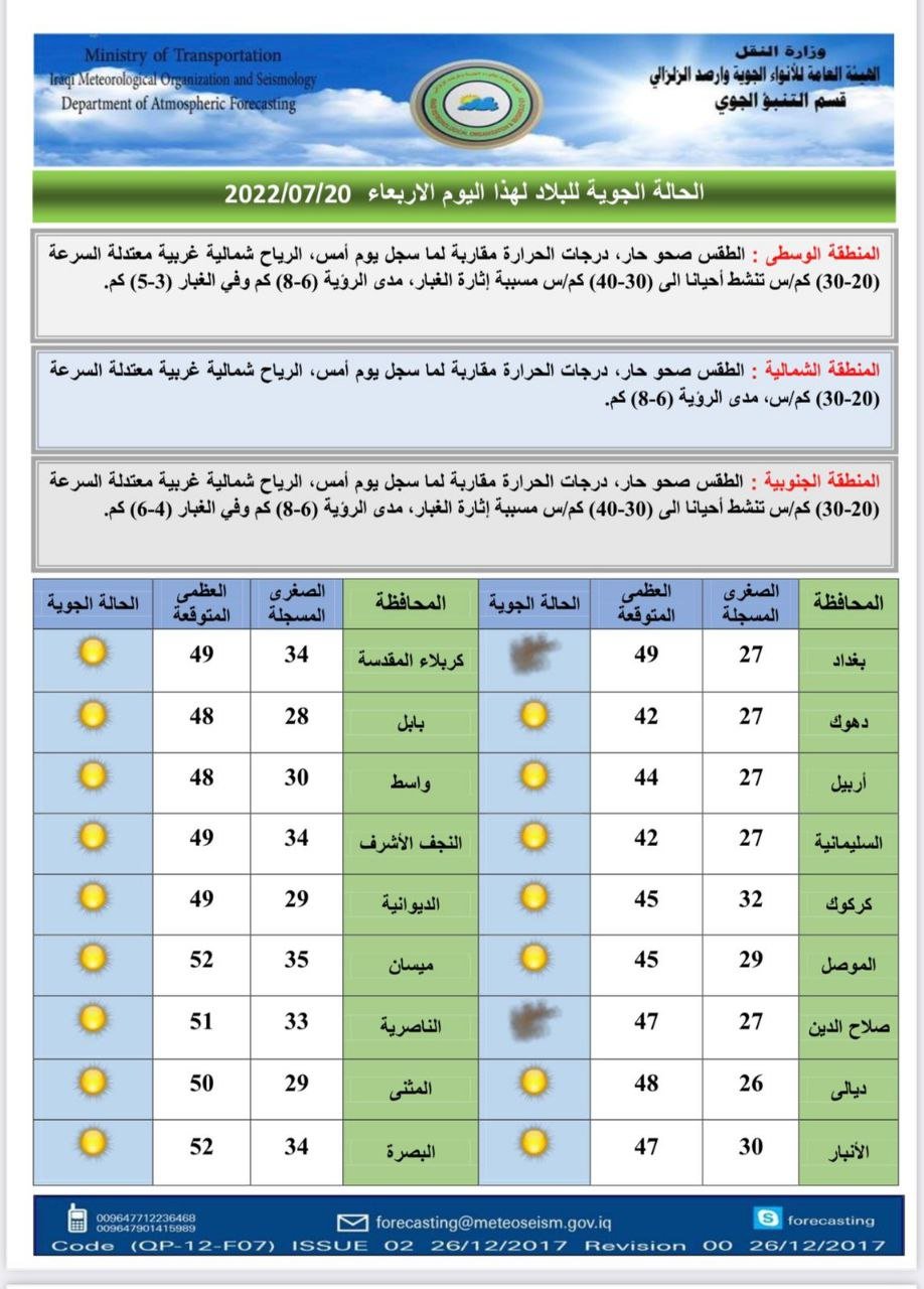 ووفق توقعات الهيئة، فإن درجة الحرارة في البصرة وميسان ستكون اليوم 52، وفي ذي قار 51، وفي المثنى 50، بينما ستكون درجة الحرارة في بغداد وكربلاء والنجف والديوانية 49 درجة مئوية.