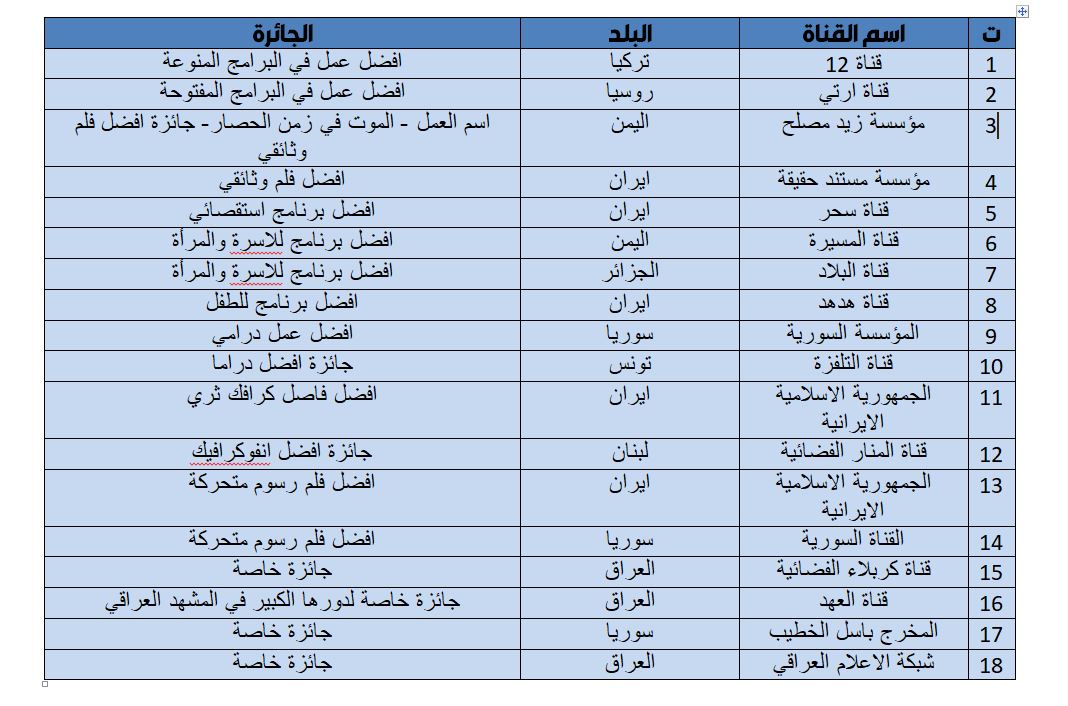 وحصدت قناة البلاد الجزائرية على جائزة افضل برنامج عائلي وجائزة افضل برنامج للطفل لقناة هدهد الايرانية وكان افضل عمل درامي من نصيب المؤسسة السورية للانتاج، وجائزة افضل دراما لقناة التلفزة التونسية.