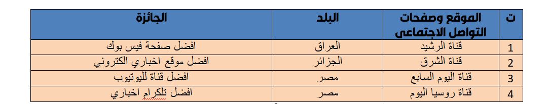 وحصلت قناة ار تي الروسية على افضل عمل في البرامج المفتوحة و قناة 12التركية على افضل عمل في البرامج المنوعة وكانت جائزة افضل فلم وثائقي ( الموت في زمن الحصار )لمؤسسة علي صالح اليمينة وجائزة افضل فلم وثائقي لمؤسسة مستند حقيقة الايرانية ،اما جائزة افضل برنامج استقصائي فكانت لقناة سحر الايرانية وجائزة افضل برنامج للاسرة والمرأة لقناة المسيرة اليمنية.