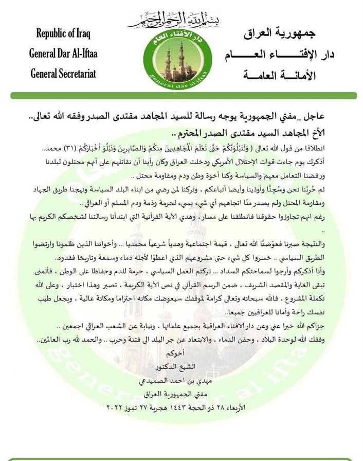 وجاء في هذه الرسالة، أن مفتي العراق وجه رسالة الى السيد الصدر: " تركتم العمل السياسي، حرمة للدم وحفاظاً على الوطن، فأتمنى تبقى الغاية والمقصد الشريف" حسبما افاد موقع بغداد اليوم _ بغداد. وفي ما يلي نص الرسالة: