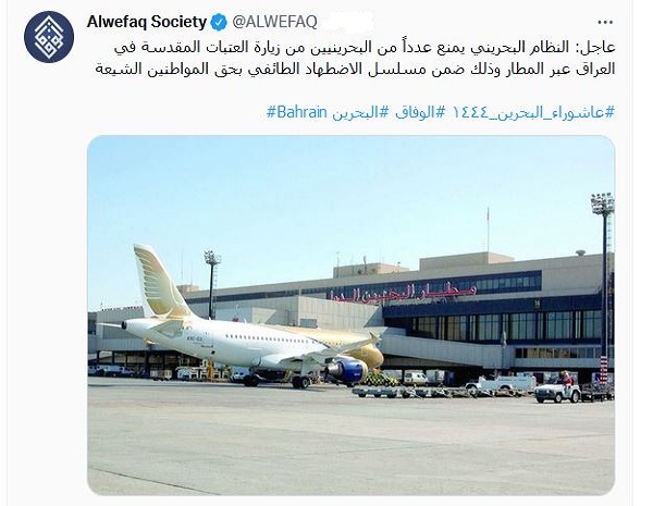 وأشارت الجمعية في تغريدة عبر حسابها على "تويتر" إلى أنَّ المنع صدر عن السلطات الأمنية في مطار البحرين الدولي "ضمن مسلسل الاضطهاد الطائفي بحق المواطنين ".