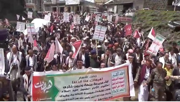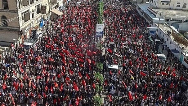 المحتشدون الذين حملوا الأعلام اليمنية والفلسطينية وأعلام ذكرى عشوراء الامام الحسين (ع) رددوا هتافات مدينة بالعدوان على اليمن وفلسطين، وداعية إلى الصمود والتصدي للمعتدين.