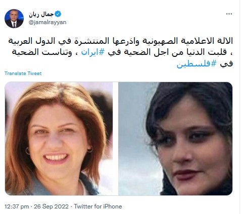 تحدث المذيع جمال ريان عن ان "الالة الاعلامية الصهيونية واذرعها المنتشرة في الدول العربية ، قلبت الدنيا في ايران ، وتناست الضحية في فلسطين" في اشارة الى الصحفية شيرين أبو عاقلة.