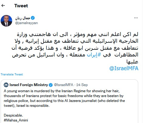 "لم اكن اعلم انني مهم ومؤثر ، الى ان هاجمتني وزارة الخارجية في الكيان الصهيوني التي تتعاطف مع الفتاة الايرانية, ولا تتعاطف مع مقتل شيرين ابو عاقلة ، و هذا يؤكد فرضية أن المظاهرات في إيران مفتعلة ، وان الكيان الصهيوني يحرض عليها".