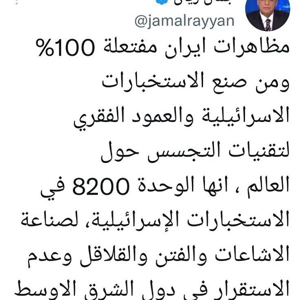 واضاف جمال ريان "مظاهرات ايران مفتعلة 100% ومن صنع الاستخبارات الصهيونية والعمود الفقري لتقنيات التجسس حول العالم، انها الوحدة 8200 في الاستخبارات الصهيونية، لصناعة الاشاعات والفتن و وعدم الاستقرار في دول منطقة غرب آسيا".