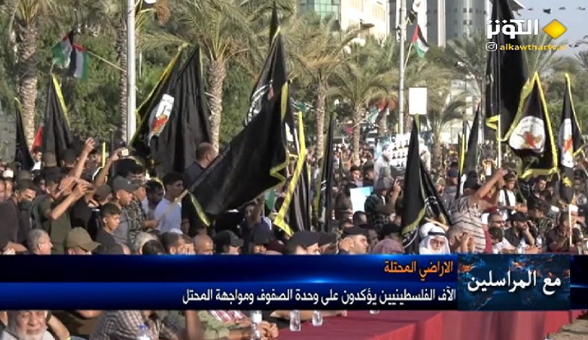 الفصائل الفلسطينية وعوائل الشهداء والاسرى الفلسطينين شاركوا بقوة وهم يهتفون لفلسطين والمقاومة الفلسطينة.