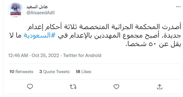 وأكد نائب رئيس المنظمة الأوروبية السعودية لحقوق الإنسان عادل السعيد في أحدث تغريدة له ان المحكمة الجزائية المتخصصة في السعودية أصدرت ثلاثة أحكام إعدام جديدة. مشيرا الى انه أصبح مجموع المهددين بالإعدام في السعودية ما لا يقل عن ٥٠ شخصا.