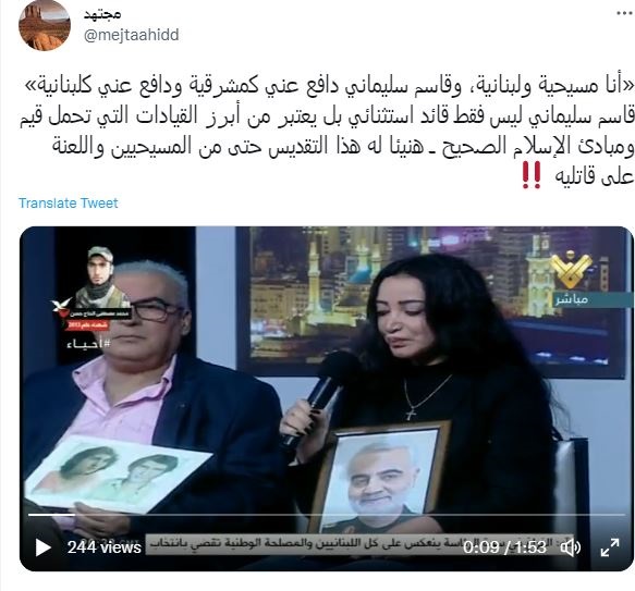 وعبّرت "الشابة المسيحية اللبنانية" في الفيديو ، عن قناعتها التامة بالولاء لمحور المقاومة، مشيرةً الى انها مهما تحدّثت عن مزايا الشهيد سليماني لن تستطيع ان توفيه حقّه، فهو "سيد شهداء محور المقاومة".