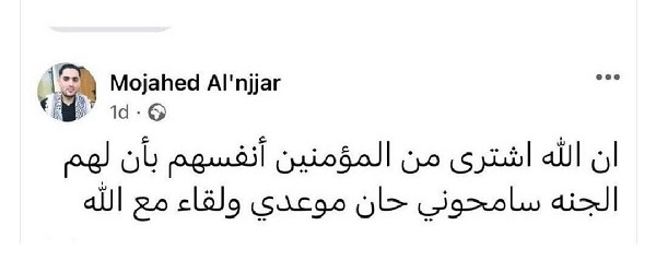 وكتب النجار في اخر تغريدة له على توتير "ان الله يشتري من المؤمنين انفسهم بأن لهم الجنة ... سامحوني حان موعدي ولقاء مع الله"