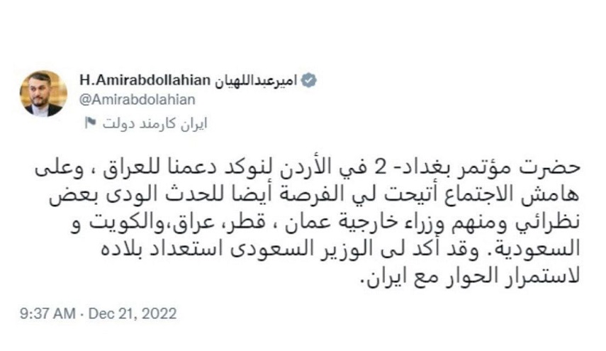 وكتب حسين أمير عبداللهيان في تغريدة له على تويتر اليوم الأربعاء : شاركت في مؤتمر بغداد- 2 في الأردن للتأكيد على دعم الجمهورية الإسلامية الإيرانية للعراق .