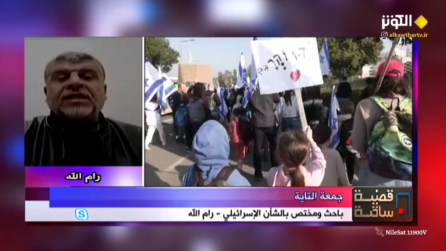 واردف التايه قائلا: المظاهرات التي تحدث تحميها المعارضة في الكيان المحتل، وهي معارضة سلمية لم تلجأ الى العنف وبالتالي الاجهزة الامنية "السلطة، والجيش الاسرائيلي" هي التي تحمي المتظاهرين وهذا الامر مقر في القانون الاسرائيلي وفي قوانين جميع الاحزاب السياسية، لكن كل هذا الامور لا تمنع ان تحدث حرب اهلية..