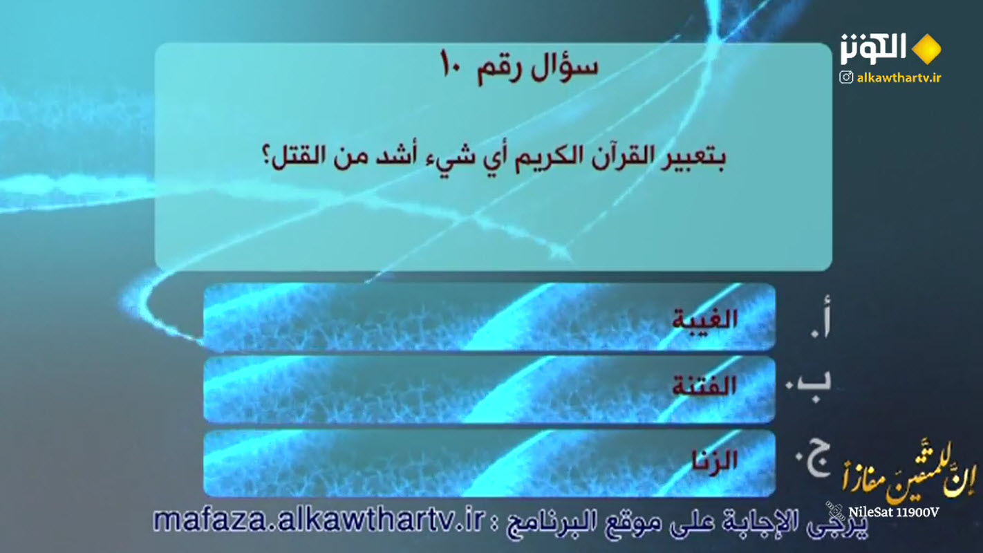 تابعوا مجريات المسابقة القرآنية علی موقع قناة الكوثر الفضائية و مواقع التواصل الاجتماعي الخاصة بقناة الكوثرالفضائية.