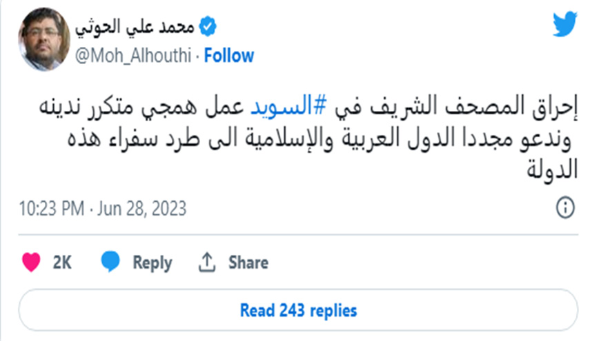 وجدد محمد علي الحوثي في تغريدة على حسابه بتويتر، مساء أمس الأربعاء، الدعوة للدول العربية والإسلامية إلى طرد سفراء دولة السويد.