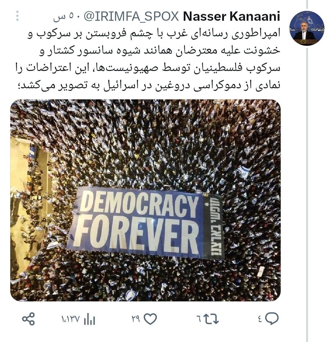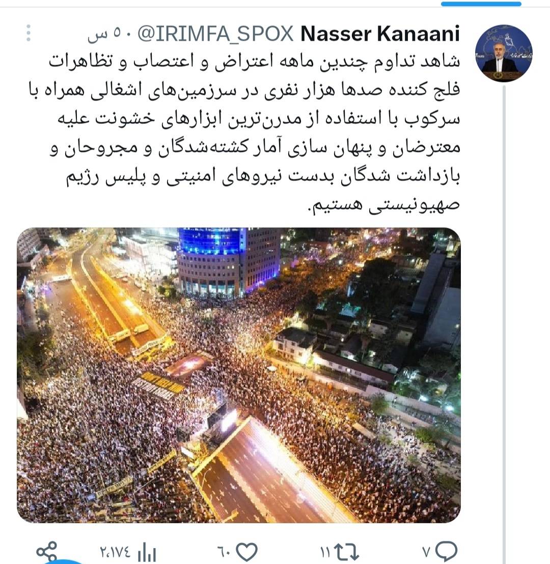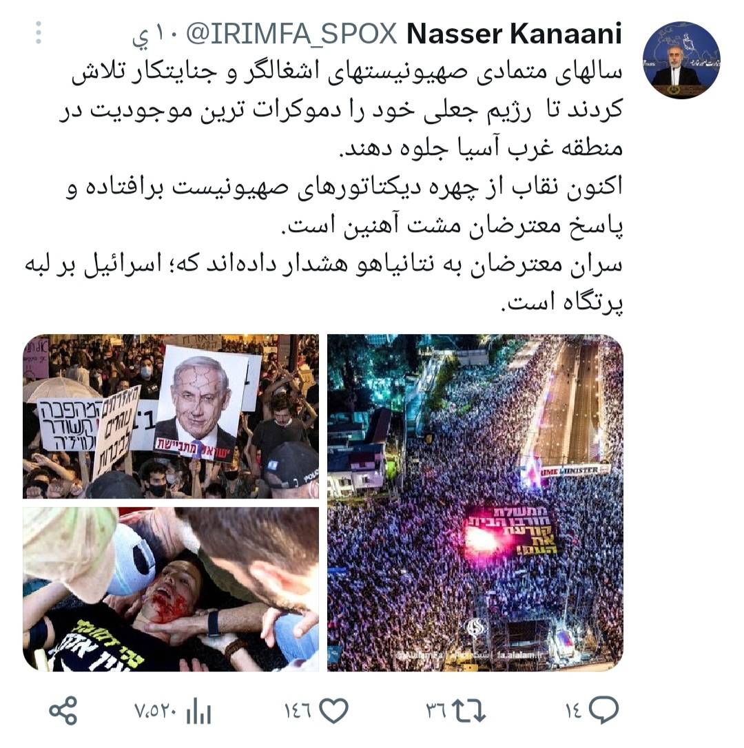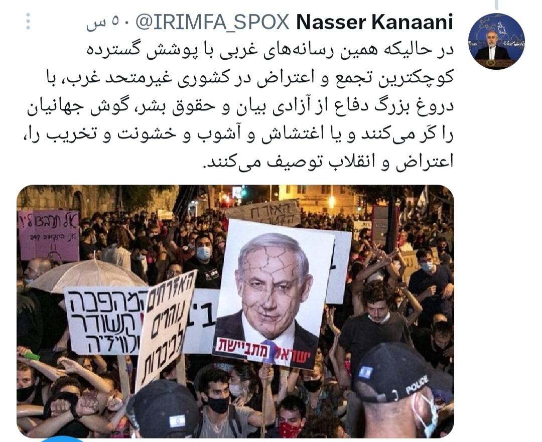 وفي هذا الصدد اشار المتحدث بأسم الخارجية الايرانية، ناصر كنعاني، في سلسلة تغريدات على صفحته في تويتر إلى ازدواجية معايير الإعلام الغربي في تغطية أخبار هذه التظاهرات ونشر صورا بهذا الخصوص، وكتب: نشاهد استمرار عدة أشهر من الاحتجاجات والإضرابات وشل التظاهرات مئات الآلاف من الاشخاص في الأراضي المحتلة وقمعها باستخدام أحدث وسائل العنف ضد المتظاهرين وإخفاء إحصائيات القتلى والجرحى والمعتقلين من قبل قوات الأمن والشرطة في الكيان الصهيوني.