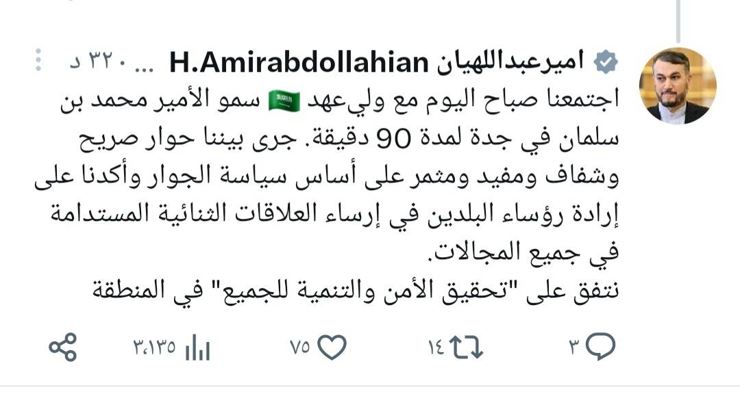 وقال أمير عبداللهيان: التقينا صباح اليوم ولي عهد السعودي الأمير محمد بن سلمان في جدة لمدة 90 دقيقة.