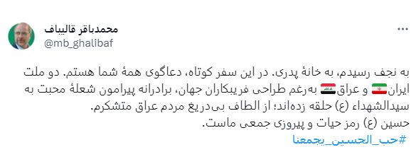 وكتب قاليباف في صفحته الشخصية على منصة "اكس" (تويتر) : وصلت الى النجف، إلى منزل والدي. في هذه الزيارة القصيرة، ادعو لكم جميعًا.