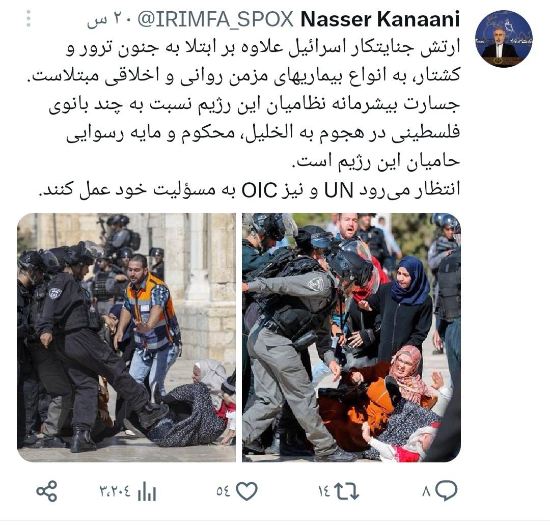 وكتب كنعاني، ردا على الاعتداء الوقح لجنود الكيان الصهيوني على عدد من النساء الفلسطينيات، عبر صفحته الشخصية على موقع " ايكس" : ان الجيش الإسرائيلی الإجرامي، بالإضافة إلى معاناته من جنون الإرهاب وارتكاب المجازر مصاب بجميع أنواع الأمراض النفسية والأخلاقية المزمنة.
