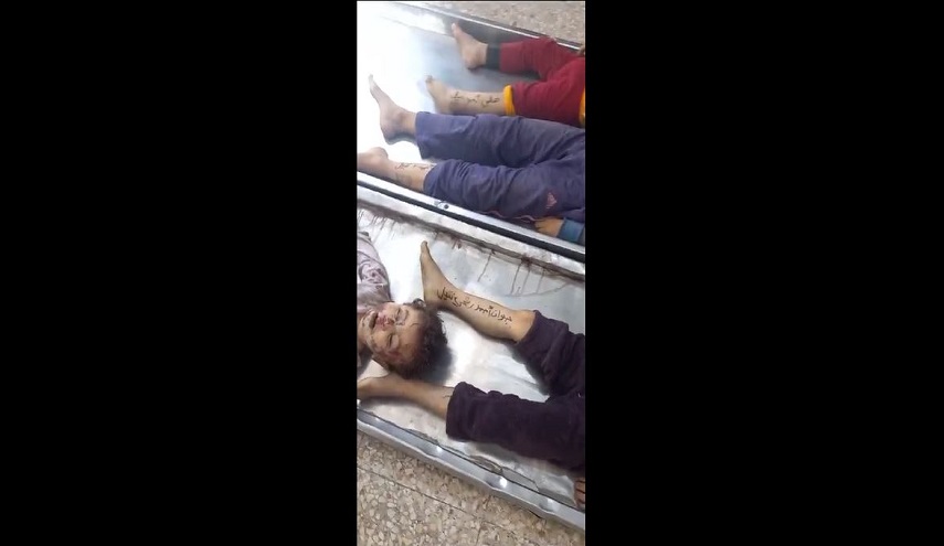 وحسب مقطع الفيديو فان الاهالي في قطاع غزة ونتيجة لكثافة الغارات الاسرائيلية وارتقاء الالاف من الشهداء وخاصة الاطفال ، قاموا بكتابة اسماء ابناءهم على اجسادهم وذلك في حالة استشهادهم يتم التعرف عليهم.