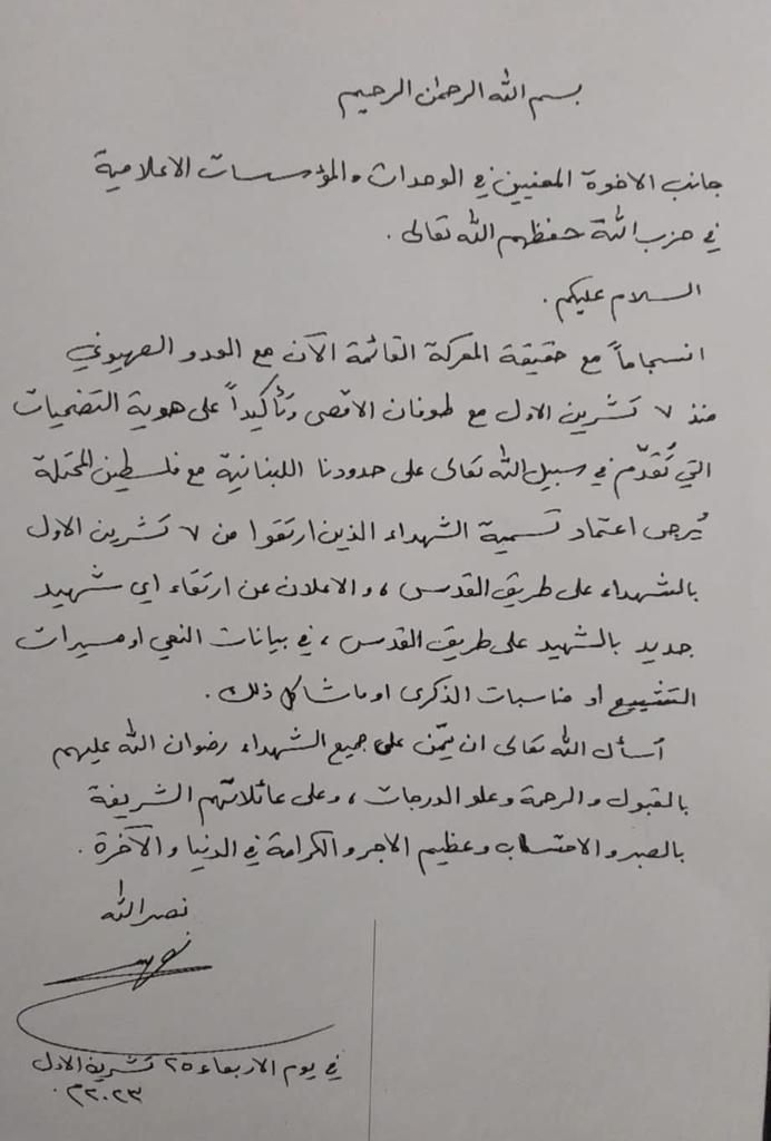 وطلب سماحة الايمن العام لحزب الله في هذه الرسالة اعتماد تسمية الشهداء الذين ارتقوا من 7 تشرين الاول بـ "الشهيد على طريق القدس".