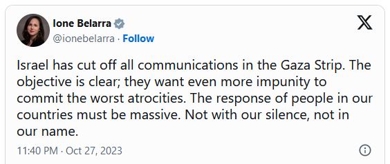 وقالت بيلارا التي دعت سابقا إلى تقديم رئيس وزراء الاحتلال بنيامين نتنياهو إلى المحكمة الجنائية الدولية، إن "قطع إسرائيل الاتصالات عن غزة هدفه ارتكاب المزيد من الفظائع".