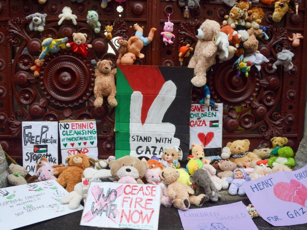 وتقدم المظاهرة عدد من أطفال الجالية الفلسطينية وعائلاتهم رافعين أعلاما ويافطات مكتوب عليها "أنقذوا أطفال غزة".