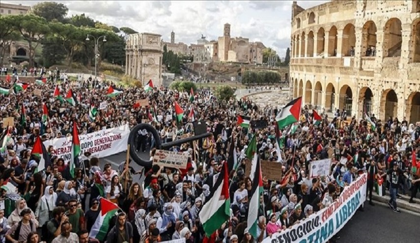 وتزامنت مظاهرة روما، السبت، مع انطلاق وقفات احتجاجية ومسيرات مليونية في العديد من الدول حول العالم تنديدا باستمرار آلة الحرب الإسرائيلي بالفتك بالمدنيين في قطاع غزة أمام أنظار العالم.