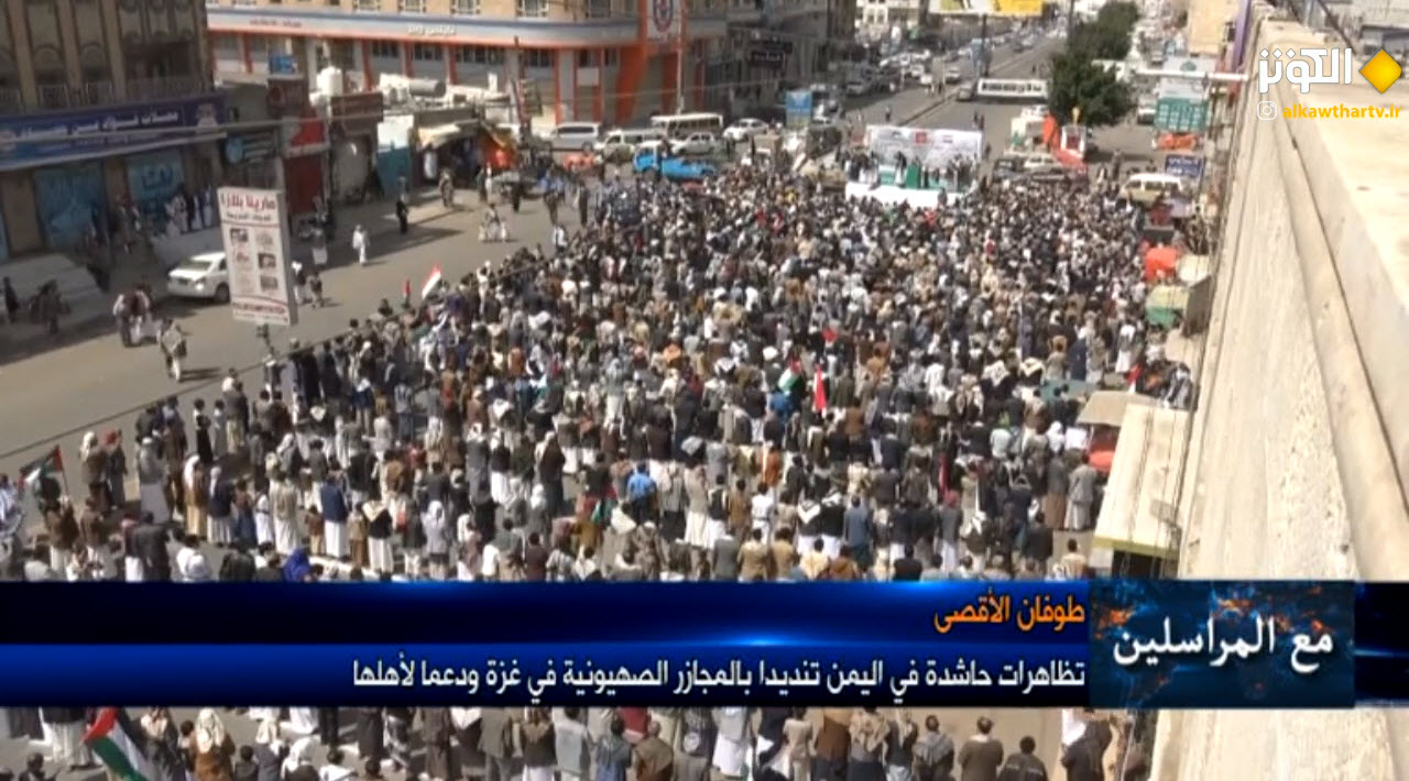 مسيرات غضب ونصرة لا تتوقف في صنعاء ومختلف المحافظات اليمنية وبعشرات الاف وقلوبهم قبل السنتهم تهتف لبيك يا اقصى لبيك يا غزة.