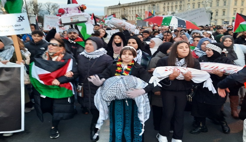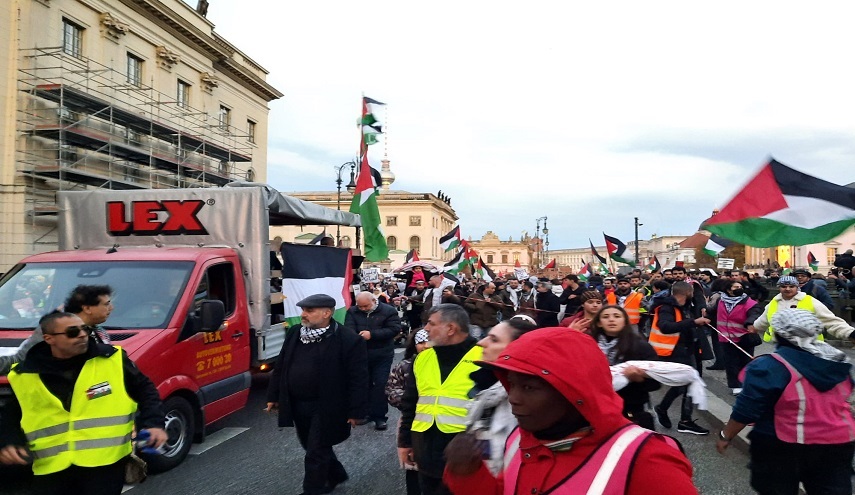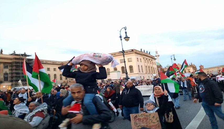 وجابت المسيرة الشعبية الحاشدة شوارع العاصمة برلين وحمل المتظاهرون الأعلام الفلسطينية واليافطات التي تحمل صور وشعارات ودمى لضحايا المجازر التي ترتكب .