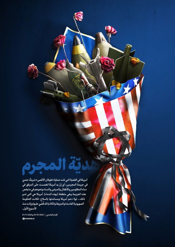 وجاء في هذا الانفوغراف نقلا عن تصريحات سماحة القائد (في 25/10/2023)، بان "أمريكا هي التي تدير في غزة ولولا دعم أمريكا ومساندتها بالسلاح، لكان الكيان الصهيوني الفاسد والمزيف والكاذب قد قُضيَ عليه وزال منذ الأسبوع الأول لعملية طوفان الاقصى.