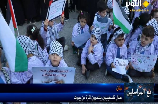 من اطفال لبنان الى أطفال غزة وفلسطين رسالة دعم وتضامن، فكل هنا ينادي" الى القدس رايحين شهداء بالملايين.."